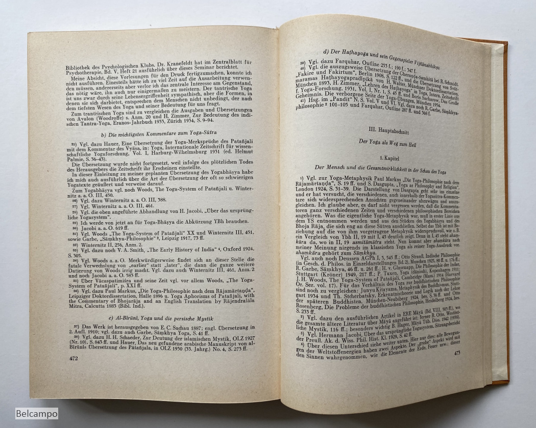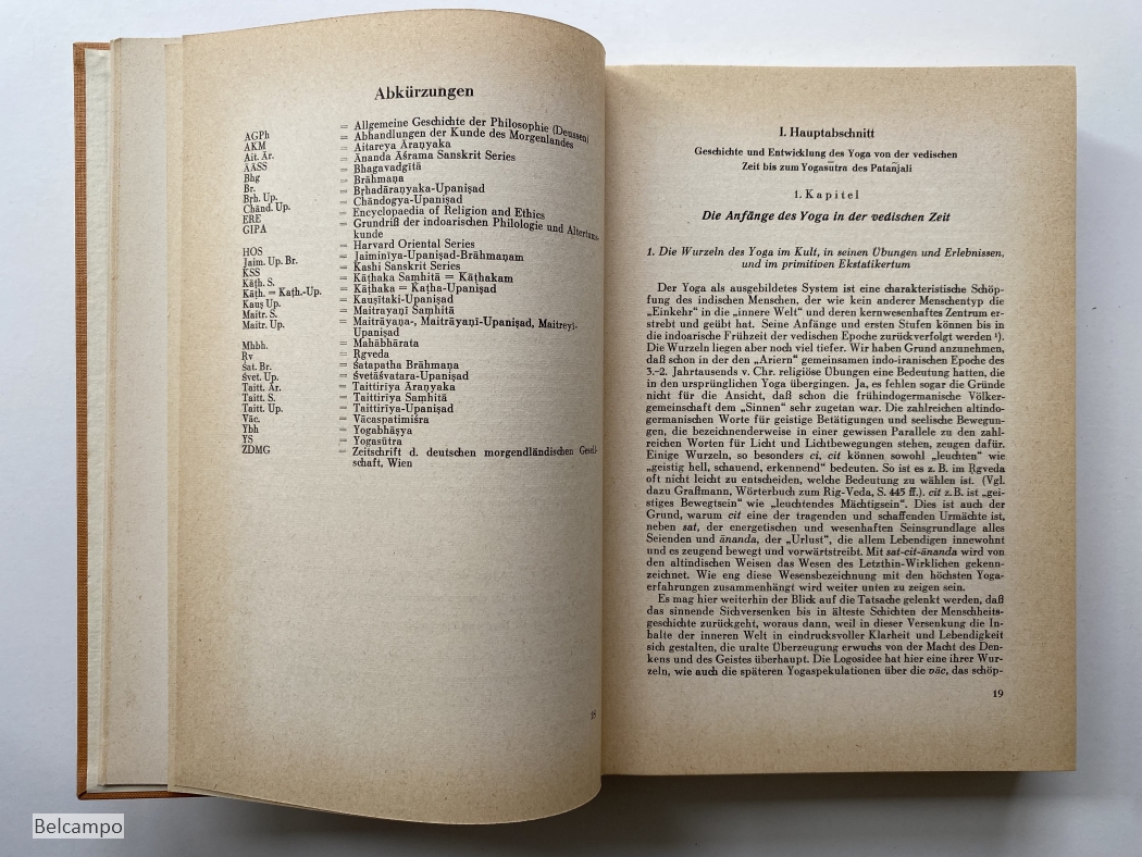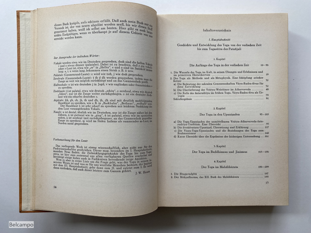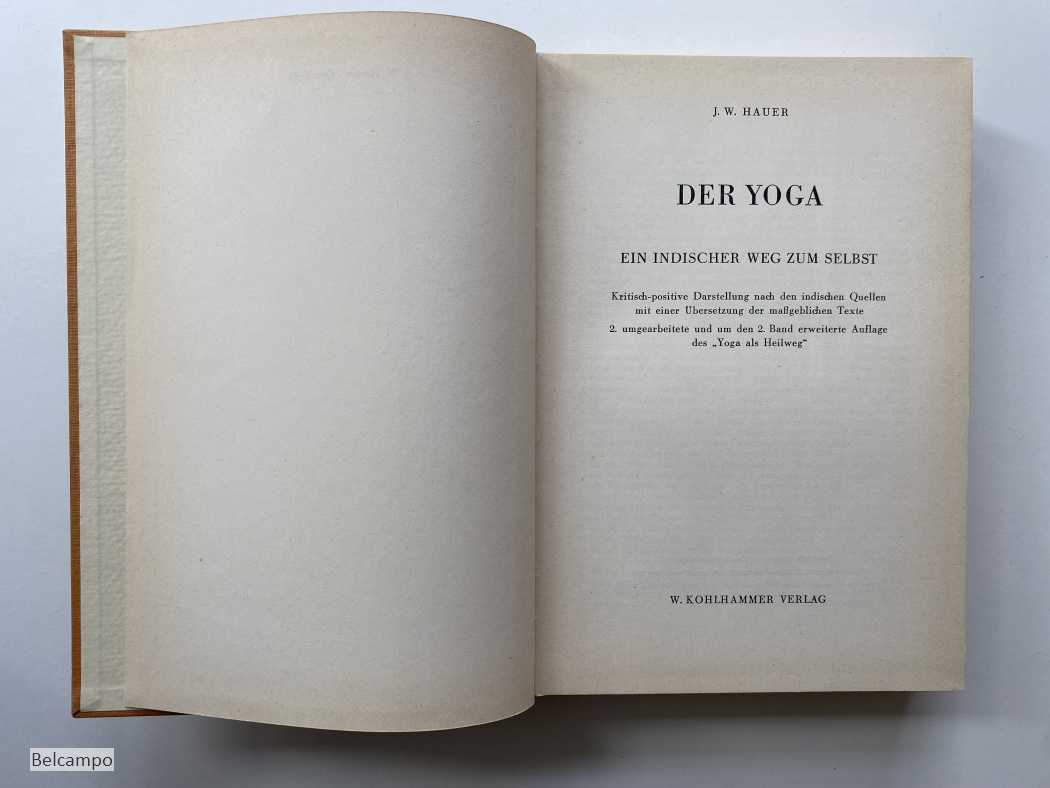 Hauer, J. W. Der Yoga Ein indischer Weg zum Selbst Kritisch-positive Darstellung nach den indischen Quellen mit einer Übersicht der massgeblichen Texte. 2. umgearbeitete und um den 2. Band erweiterte Auflage des "Yoga als Heilweg". Stuttgart, W. Kohlhammer, 1958. gr.8° (23 x 16 cm.), 487 S., Leineneinband. Unteres Kapital bestoßen (Abb. 4). Seitenränder ein wenig nachgedunkelt, sonst sauberes Exemplar.