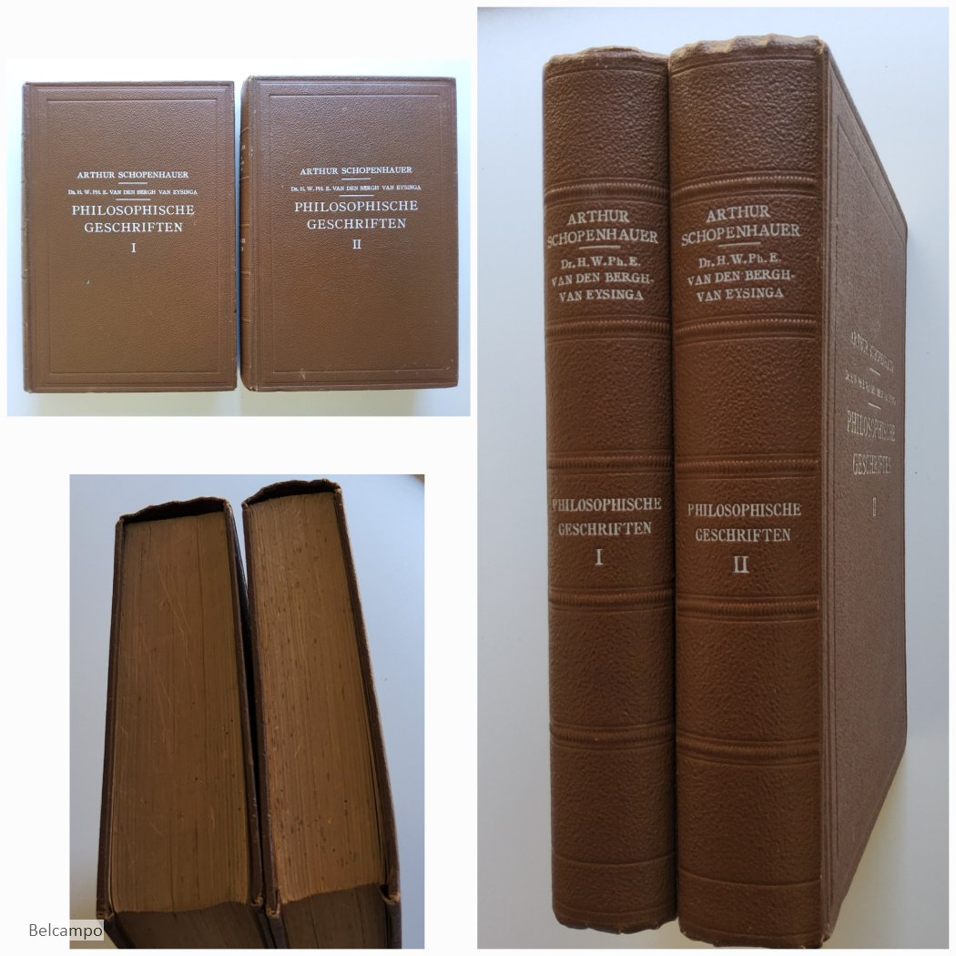 Schopenhauer, Arthur. Philosophische geschriften. Parerga en Paralipomena [toevoegsels en uitlaatsels] kleine philosophische geschriften. Vertaald en van een inleiding voorzien door van den Bergh van Eysinga. Amsterdam, Em. Querido, 1908. 2 delen. Gr. 8° (25 x 17 cm.). XIV,368, 520 pp. Boven- en onderkant van de rug ingedeukt. Platten licht geschaafd. Sneden met wat roestvlekken. Schutbladen, franse titel en titelpaginana ´s met bruine vlekken. Beschadigingen aan bladzijde zie afb. 6.