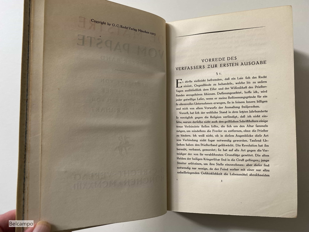 Maistre, Joseph Marie de. Vom Papste. Übersetz v. Moritz Lieber. Hrsg. v. Joseph Bernhart. Katholikon. Werke und Urkunden Band IV-V. München, O. C. Recht. 1923. 2 Bde. in 1 Band. 2 Bll., 337 (1), 2 Bll., 338 (1) Seiten. Gr.-8° (23 x 15 cm.). Pergamentband mit 5 durchgez. Bünden, umgelegten Kanten, Kopfgoldschnitt. Einband ein wenig Fleckig. Widmung (Abb. 7). Lesebändchen mit Riss. Schnitt etwas beschädigt.