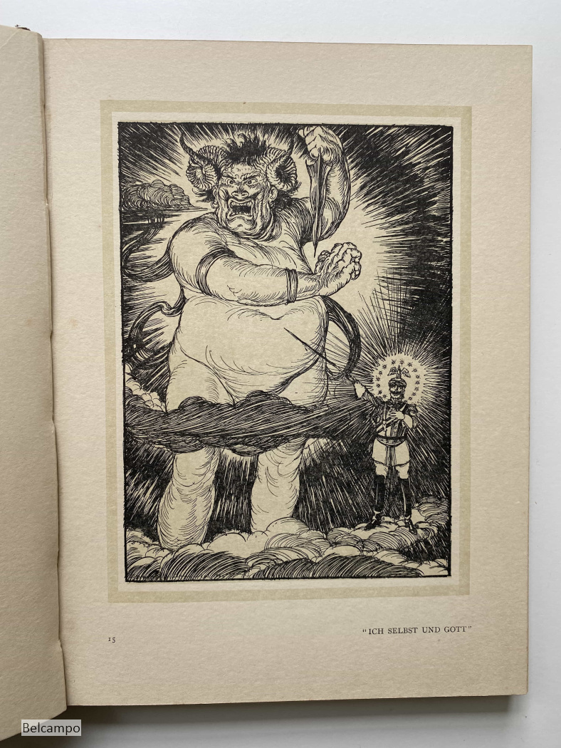 SULLIVAN, EDMUND J(OSEPH). The Kaiser`s Garland. London, William Heinemann, 1915. Hardcover. First edition. 4° (28,5 x 21,5 cm.) 95pp. Light brown, illustrated dustjacket (on the inner repaired with tape) over paper-covered boards with same design and black lettering on cover and spine. Frontispiece cartoon and 43 full-page reproductions printed on heavy paper. Dustjacket with wear along edges and small tears and a removed small library ticket. Free endpapers foxed (see picture 7 and 25).