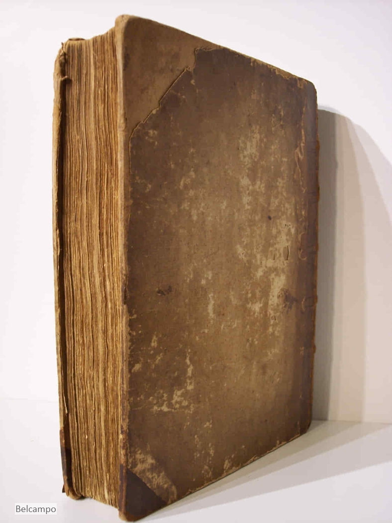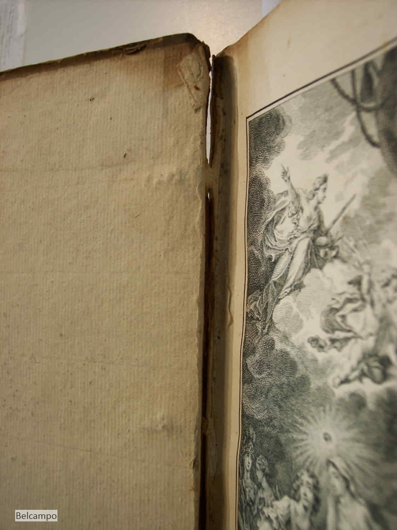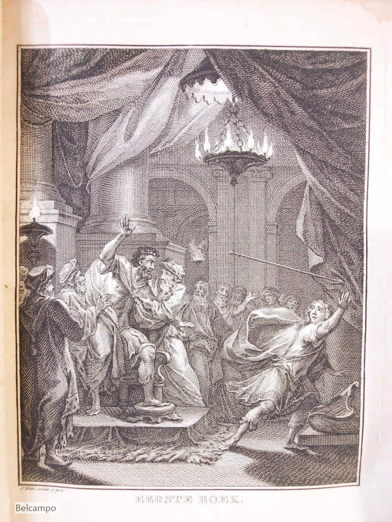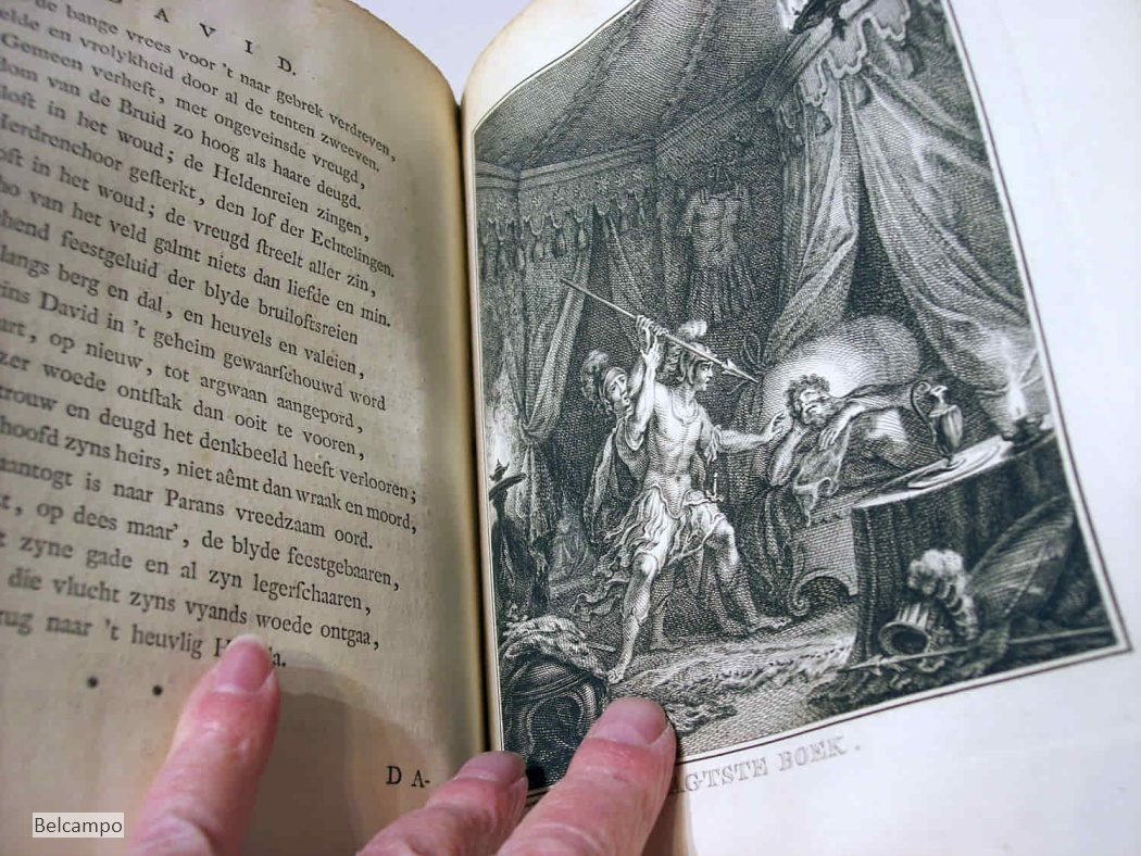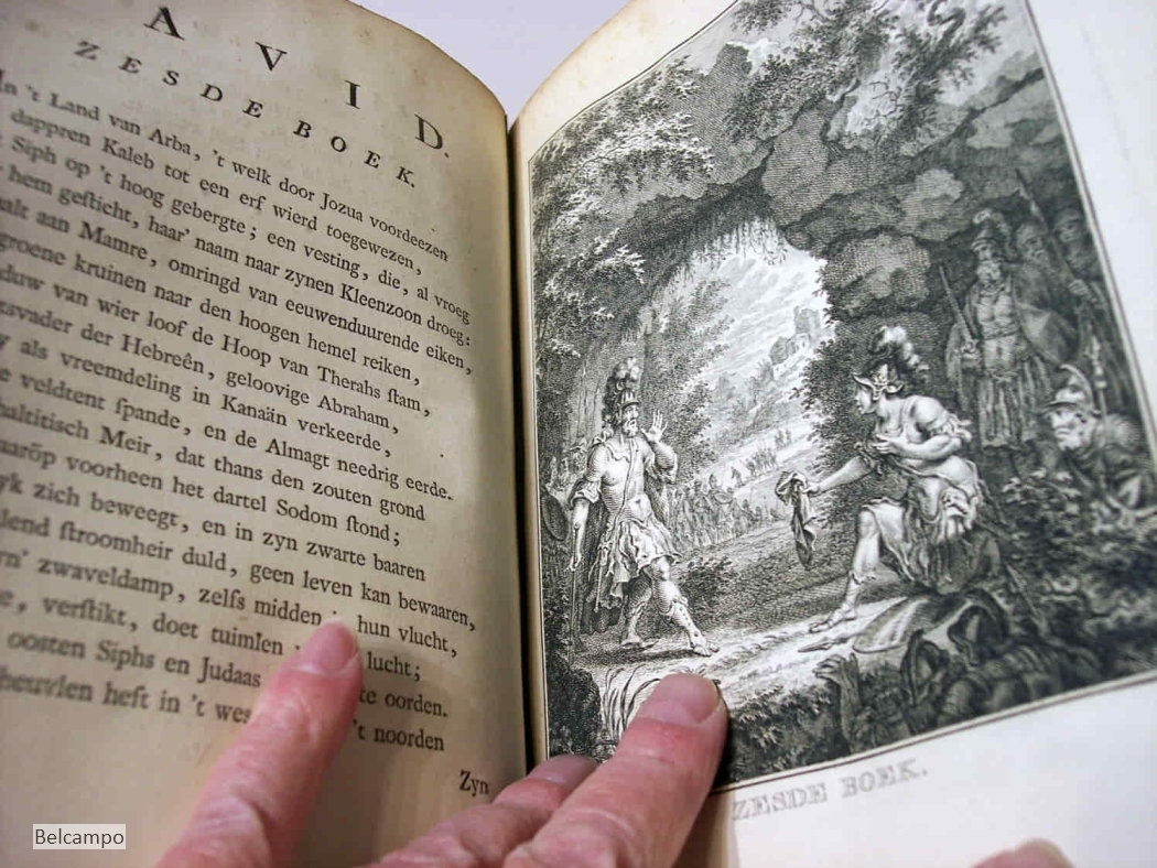 MERKEN, LUCRETIA WILHELMINA VAN. David in twaalf boeken. Amsterdam, Pieter Meijer, 1767. (de gravure v.d. titelpagina is 1766 gedateerd zie afb. 2) 4º ( 26,x20,5 cm). IV, 395, I pp. Halfleren band met beschadigd marmerpapier ?. Titelgravure van S. Fokke, titelvignet van J. v(an der) Schleij, 1761, en 12 paginagrote gravures van Fokke, die voorafgaan aan elk van de 12 boeken. Auteur en titel niet meer leesbaar op geribde rug en klein stukje uit de onderkant. Achterplat aan bovenzijde rug 8 cm. ingescheurd (zie afb. 3). Voorste schutblad ontbreekt, schutblad achter kreukelig. Titelgravure beduimeld. Boekblok is vast. In prijs verlaagd van € 145,- naar € 95,-.