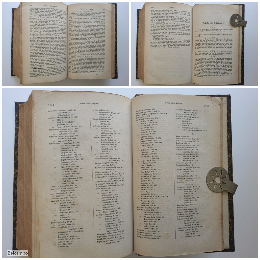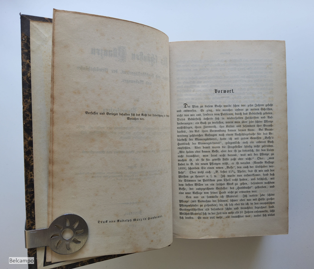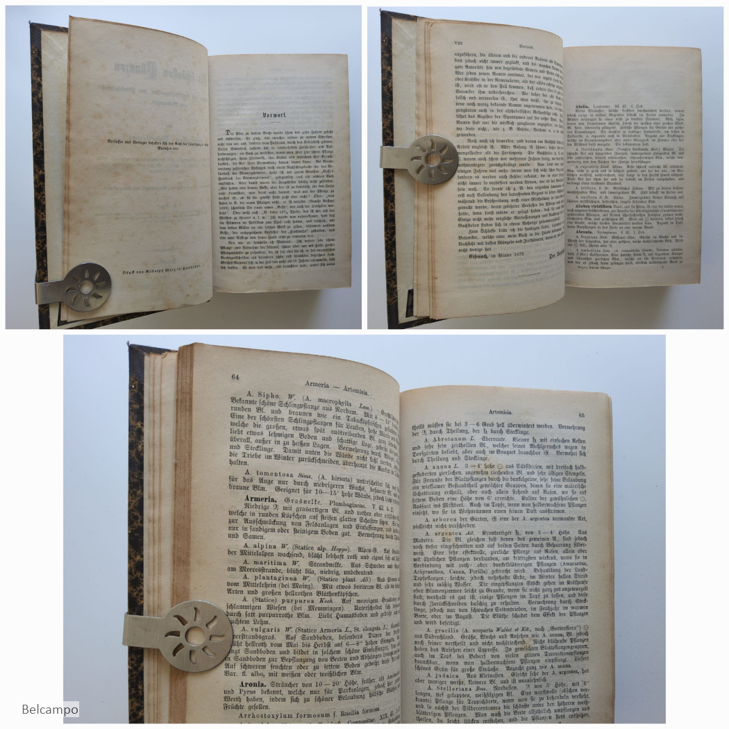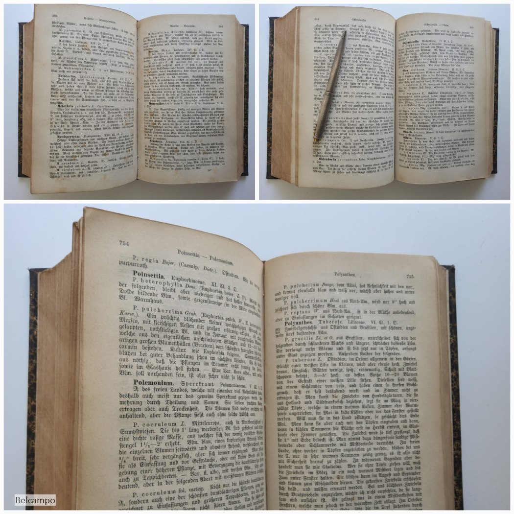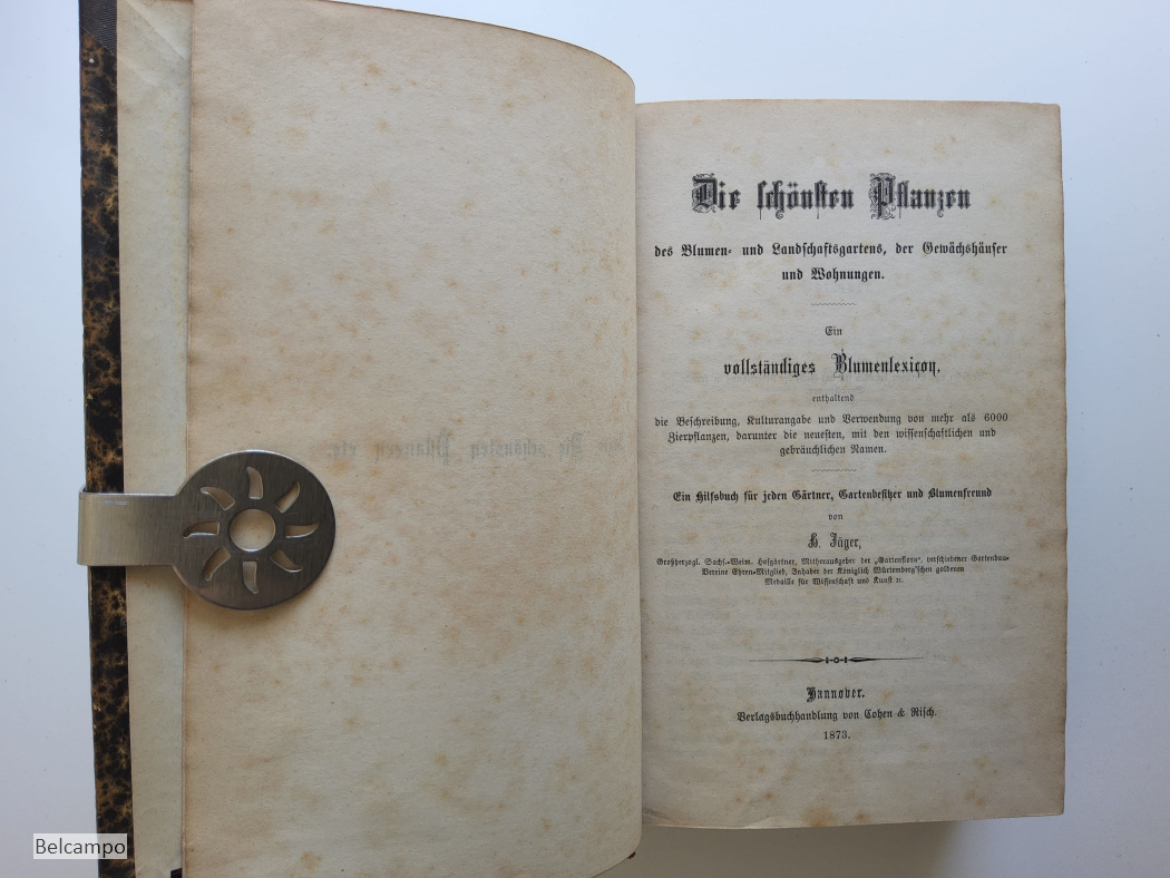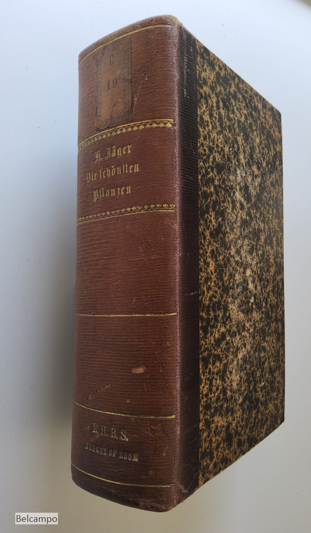 Jäger, H. Die schönsten Pflanzen. Des Blumen- und Landschaftsgartens, der Gewächshäuser und Wohnungen. Ein vollständiges Blumenlexikon enthaltend die Beschreibung, Kulturangabe und Verwendung von mehr als 6000 Zierpflanzen, darunter die neuesten, mit den wissenschaftlichen und gebräuchlichen Namen. Ein Hilfsbuch für jeden Gärtner, Gartenbesitzer und Blumenfreund. Hannover, Verlagsbuchhandlung von Cohen und Risch, 1873. VIII, 1080 S. 8° ( 22 x 14 cm.). Halbleder mit marmorierte Deckel. Bibliothek Etikett auf den Rücken, Titel und Bibliothek in Goldprägung R.H.B.S. (Rijks hogere burgerschool) Bergen op Zoom. Rücken und Einband ein wenig beschabt. Teilweise Papier gebräunt, Eselsohren. Sehe Abbildungen.
