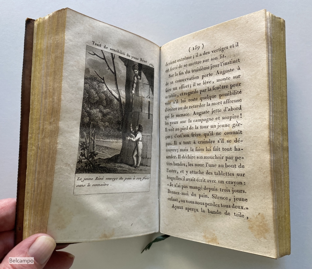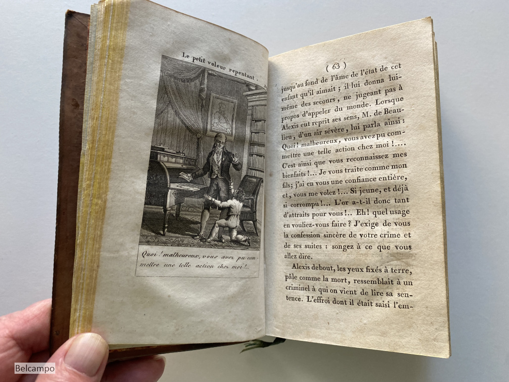 Renneville, Sophie de. Le Conteur Moraliste, ou le Bonheur par la vertu. Paris, Belin-Leprieur, 1816.  3, 322 pages, 2. Frontispice en noir et blanc. Trois planches de gravures en noir et blanc, hors-texte. Kl.-8° (16 x 10 cm.). Relié plein cuir marron.