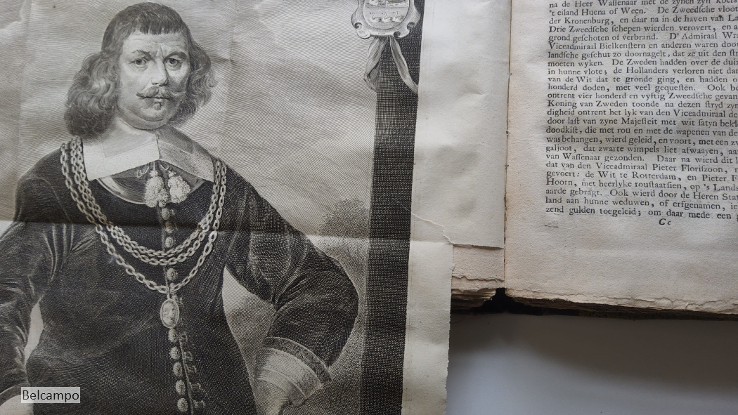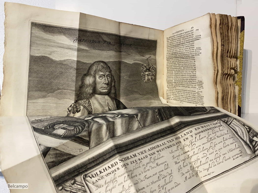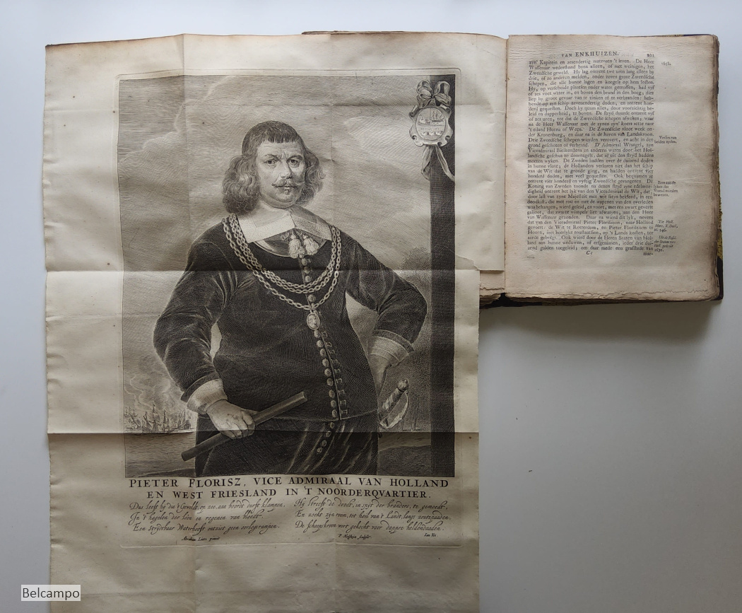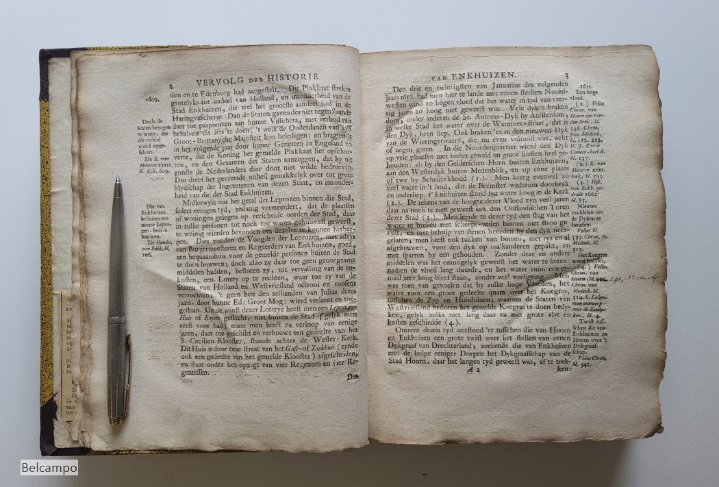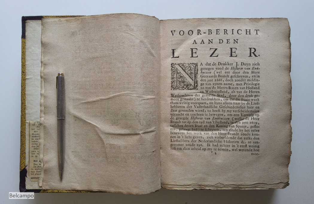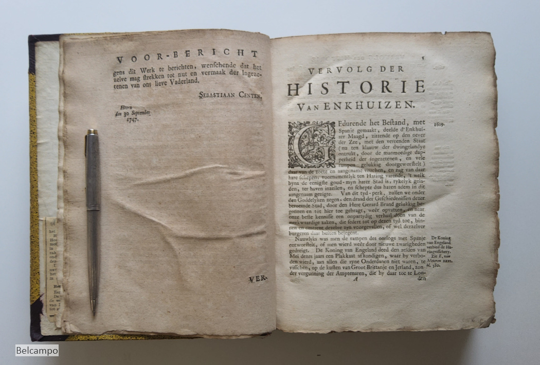 Centen, Sebastian. Vervolg der historie van de vermaarde zee- en koopstad Enkhuizen, behelzende verscheide gedenkwaardige geschiedenissen, die zo in als omtrent dezelve, en door geheel Westvriesland en het Noorderquartier gebeurt zyn door Sebastiaan Centen. Hoorn, Jacob Duyn, 1747. 8° (21,5 x 17 cm.). [6], 448, [23] p. Halfleren band uit de tijd (?). Met twee grote uitslaande portretten (46,5 x 34,5 cm.). Verbinding rug met voorplat aan voorkant 14 cm. ingescheurd (afb. 2 ). Voorste schutbladen verstevigd met papier. Eerste bladzijden beduimeld en vlekkig. Titelpagina gebruind. De binding op bladzijde 65, 193, 200 is gedeeltelijk los (afb. 16). Beide gravures hebben aan één zijde een gerepareerd scheurtje van 2,5 cm. Zie de afbeeldingen voor verdere defecten. Zeldzaam.