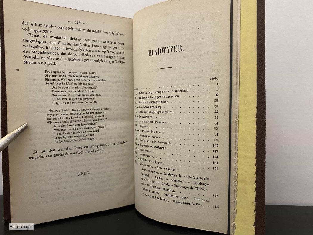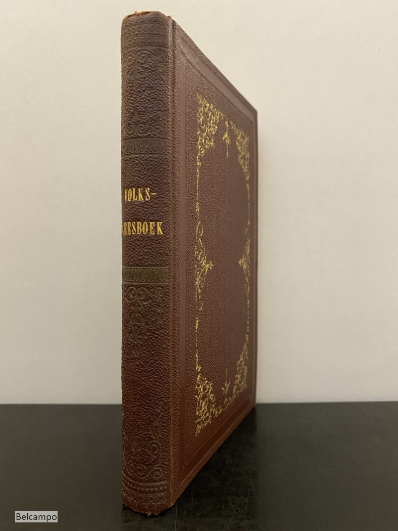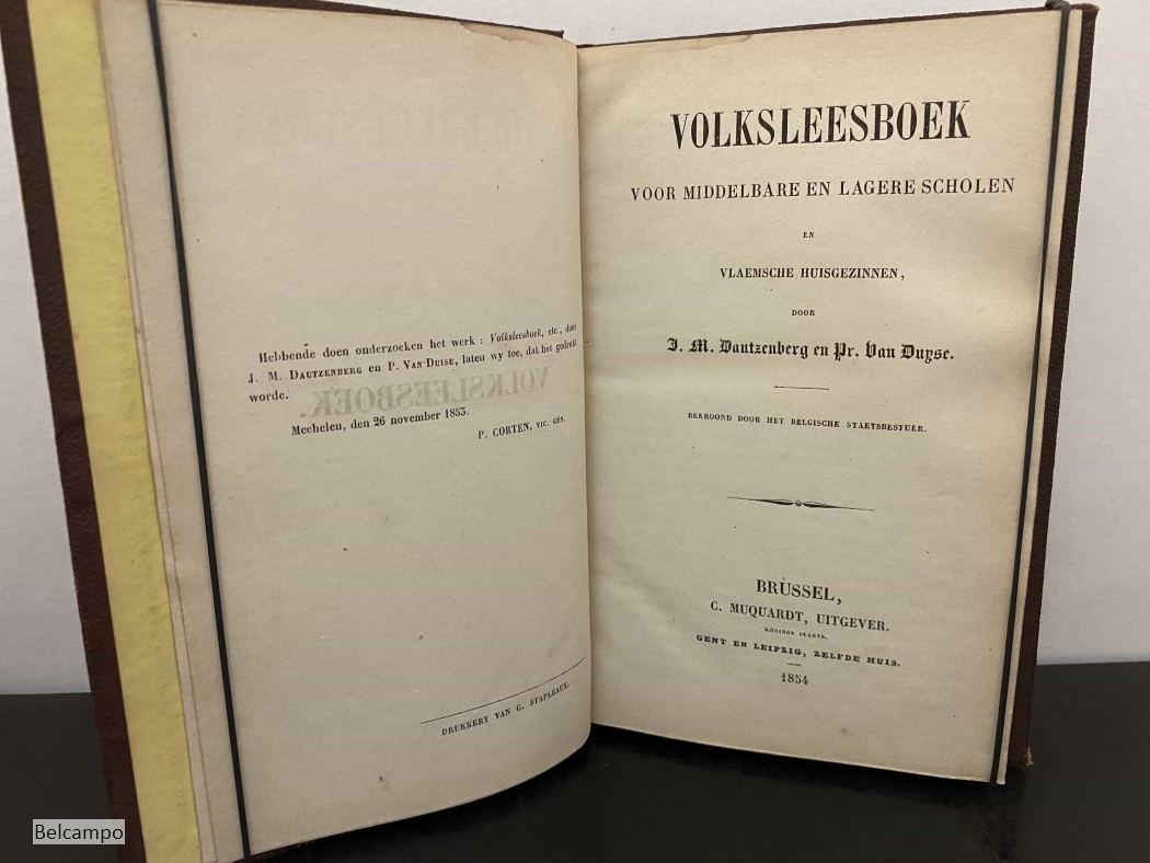 J. M. Dautzenberg en Pr. van Duyse. Volksleesboek voor middelbare en lagere scholen en Vlaemsche huisgezinnen. Brussel, C. Mucquardt, 1854 V, 378 p., errata. kl. 8° (18 x 12 cm.) Gebonden rondom goud op snee. Prijsbandje. Schutbladen met grote vlek (afb. 5,6). Vanaf pagina 372 zijn de bladzijden rechts op de snee gekarteld (afb.7,8) . Zeldzaam.