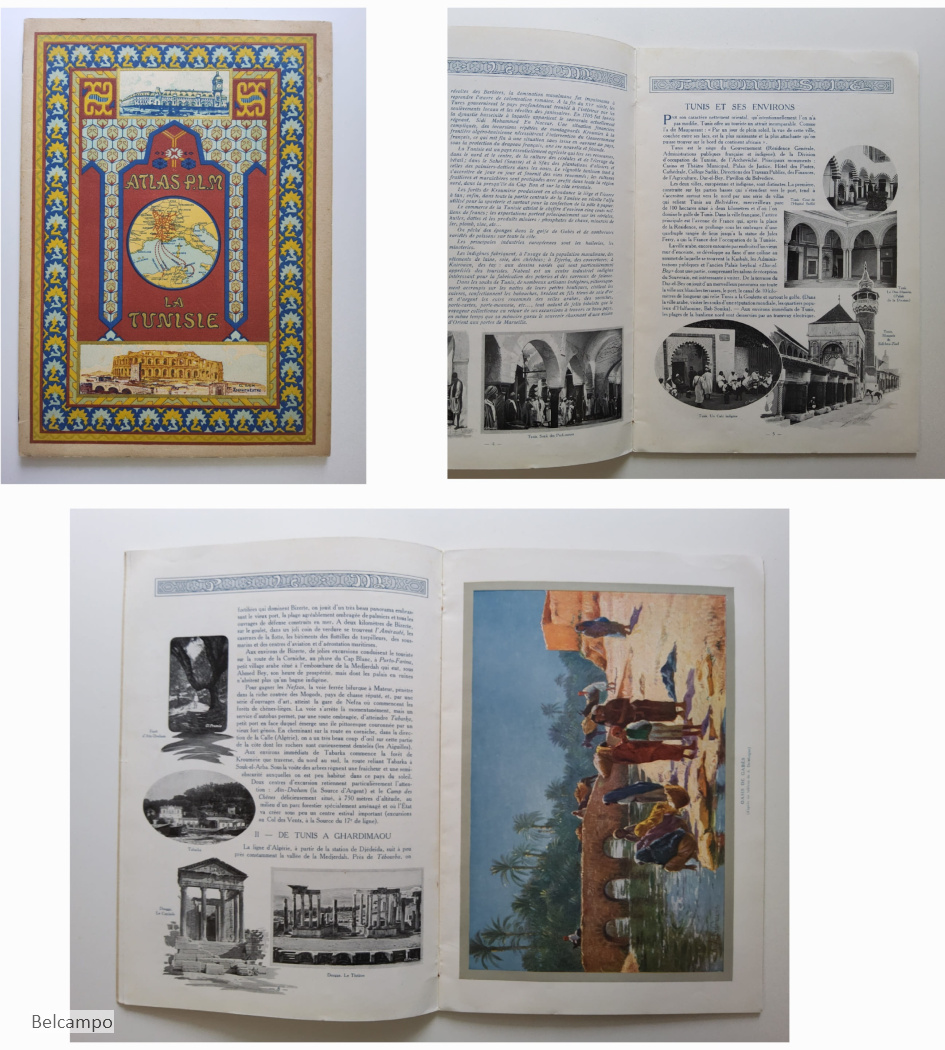 Chemins de Fer Paris-Lyon-Méditerrannée. Atlas P.L.M. Les Alpes Françaises Savoie ../ Jura Bourgogne ... / Valley of the Rhône ... / La Côte d'Azur ../ Auvergne Cévennes ... / La Tunisie (16 pages). Ensemble 6 Toms. Paris, J. Barreau Éditeur, s.d. 20 pages. Format 26 x 19 cms. Brochures, agrafé. Les agrafes sont affectées par la rouille, qui laisse des taches brunes ici et là. Certaines couvertures de livre ont des taches brunes. Voir les photos pour plus de détails. Einbande gering braunfleckig. Klammern angerostet. Eine Broschüre auf Englisch.
