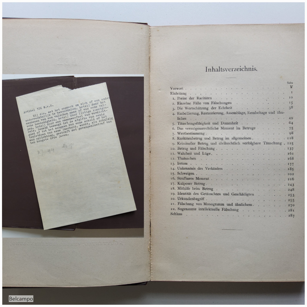 Gross, Hanns. Der Raritätenbetrug. Berlin, J. Guttentag Verlagsbuchhaltug G.M.B.H. 1901. gr. 8° (22,5 x 15 cm.). VIII, 288 S. Leinen. Der Einband am Rücken etwas beschabt. Oberes und unteres Kapital leicht bestoßen. Die Heftklammern sind rostig. Blatt mit Inhaltsverzeichnis und Vorwort hat sich gelöst (Abb. 4). Auf drei Stellen sind die Seiten nicht vollständig zu offenen (Abb. 5). Fast alle Seiten haben rechts oben ein leichten Knick.