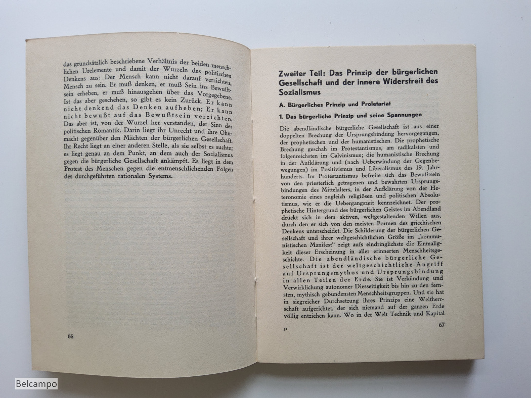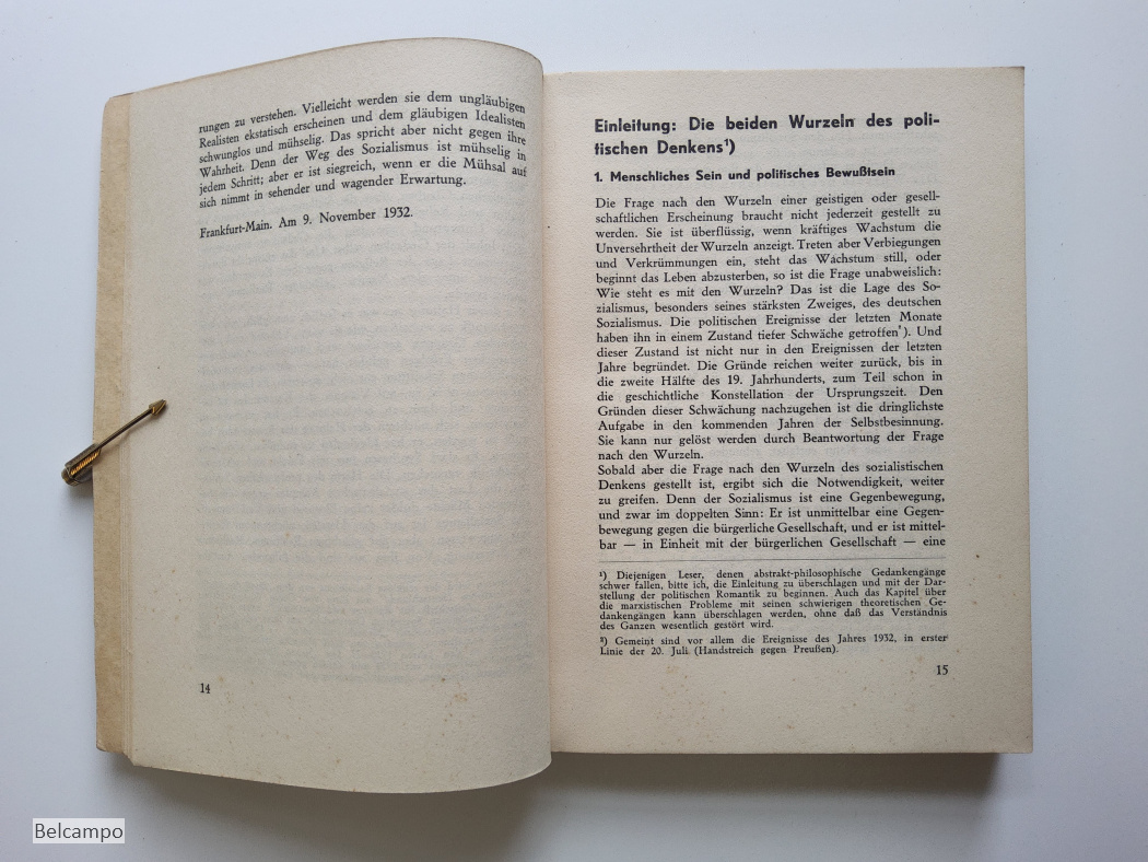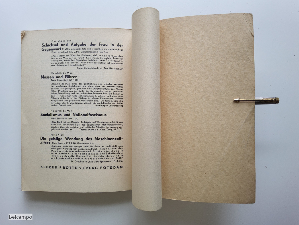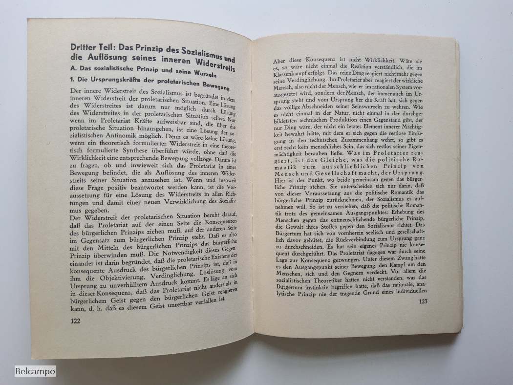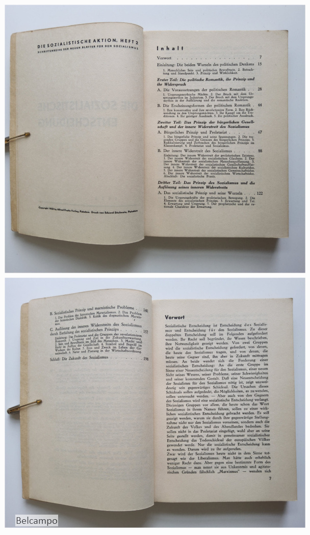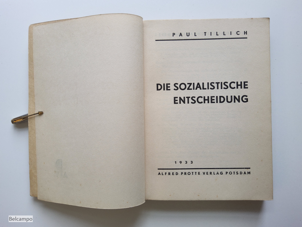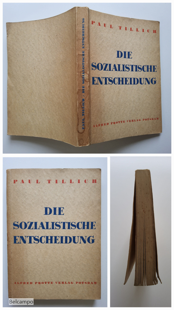 Tillich, Paul. Die sozialistische Entscheidung. (= Die sozialistische Aktion, Heft 2, Schriftenreihe der Neuen Blätter für den Sozialismus). Potsdam, Alfred Protte Verlag, 1933. 8° (20,5 x 15 cm), 201 S., 2 Bll. Broschüre. Buchdeckel an den Rändern gebraünt sowie der Rücken der auch Feuchtfleckig hat. Hintere Buchdeckel hat links oben en kleiner Knick der auf vier Seiten weiter geht. Schnitt angestaubt, fleckig (Abb. 2, 7 ).