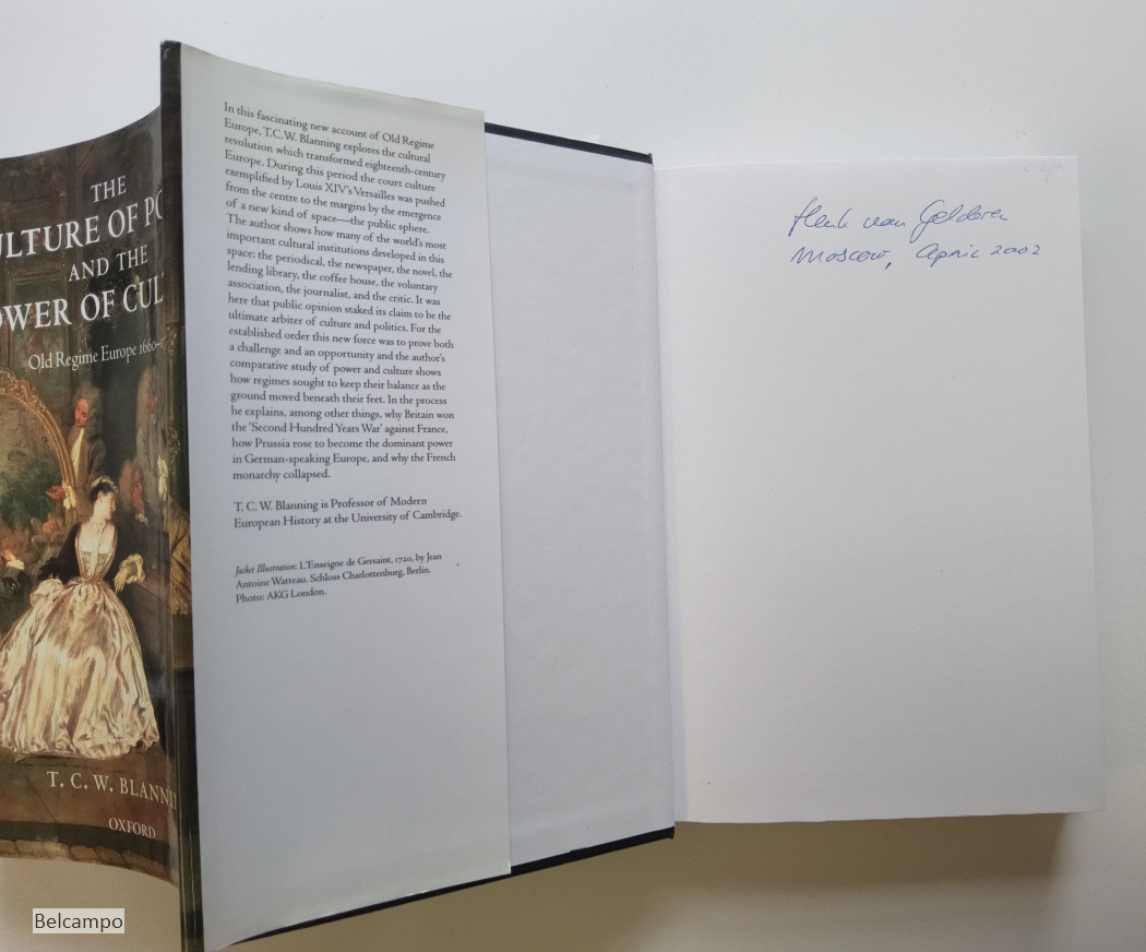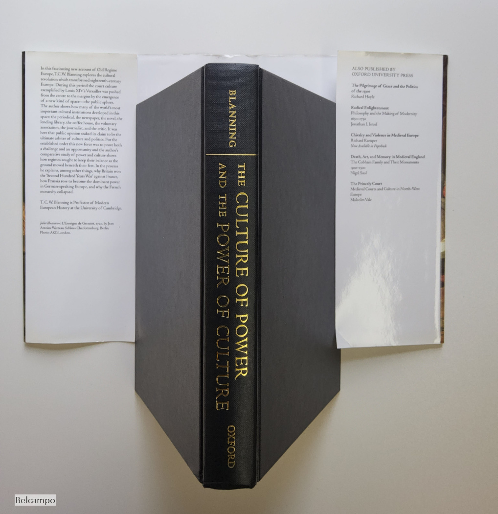 Blanning, T. C. W. The Culture of Power and the Power of Culture. Old Regime Europe 1660-1789. Oxford, University Press, 2002. gr. 8° (24 x 16,5 cm.). 479 p. Hardcover with dust-jacket. Very small teat at the top of the cover. Tailcap bumped (pic. 2, 4 ). Name and place on front free-endpaper. Otherwise a clean copy.